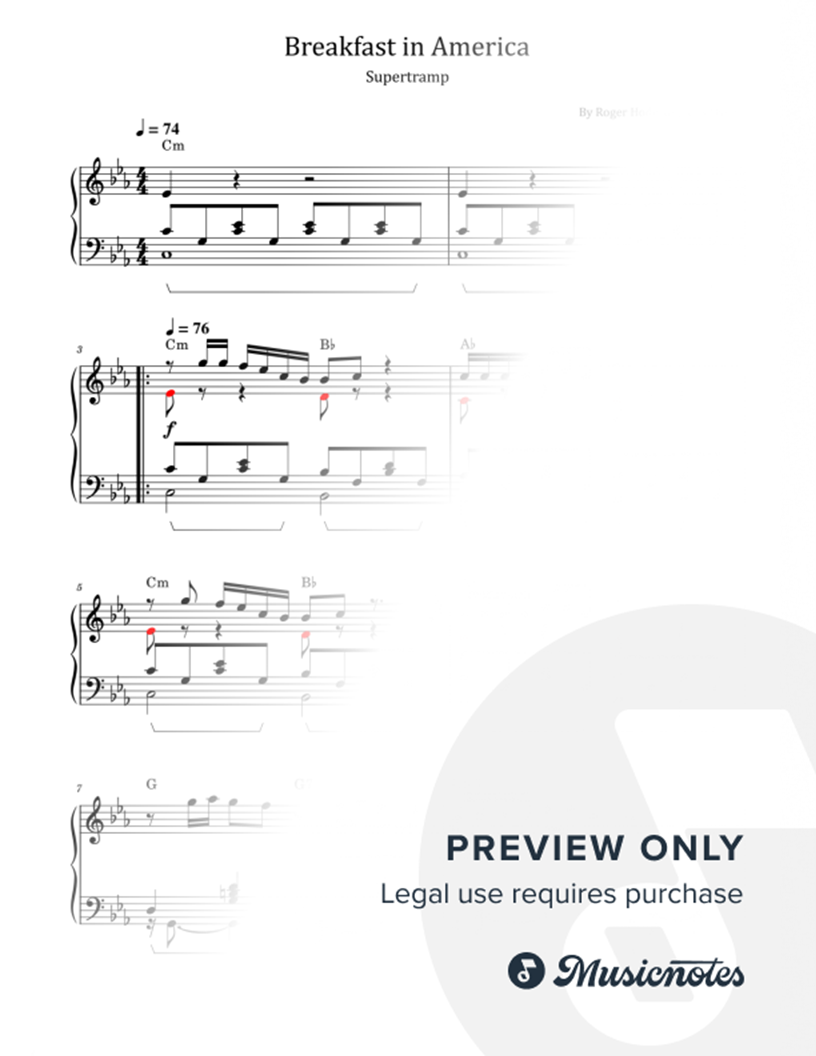Breakfast in america, Supertramp, for Piano Solo With Chords, Sheet Music 4 Pages.
