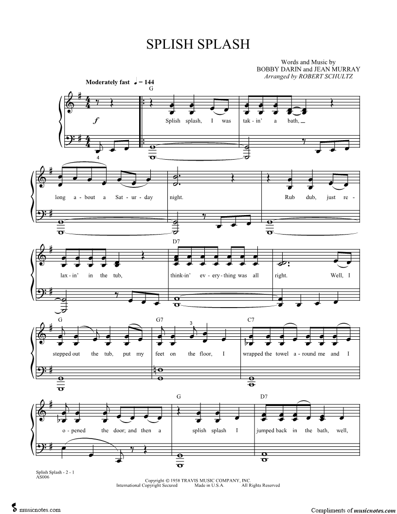 Splish splash, I was takin' a bath, long about a Saturday night. |