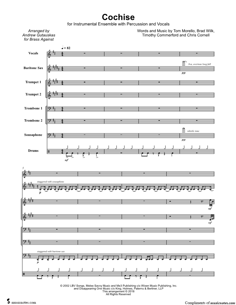 Voice, range: A3-B4 Trumpet 1, range: F#4-F#6 Trumpet 2, range: C#4-C#6 Trombone 1, range: E2-Ab4 Trombone 2, range: E2-F#4 Sousaphone, range: D2-C#5 Baritone Saxophone Drums | |