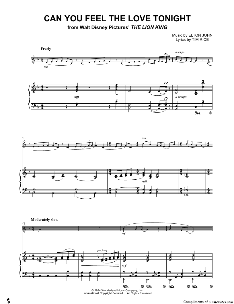 1. Can You Feel the Love Tonight - Piano Accompaniment (click here to preview and play this piece) Composer: Lyricist: Scored For:Solo & Accompaniment and Instrumental Part Instruments:Piano Accompaniment, C Instrument, Oboe, Violin, Flute and Recorder Number of pages:3 Click here to purchase this piece separately for $4.99 |