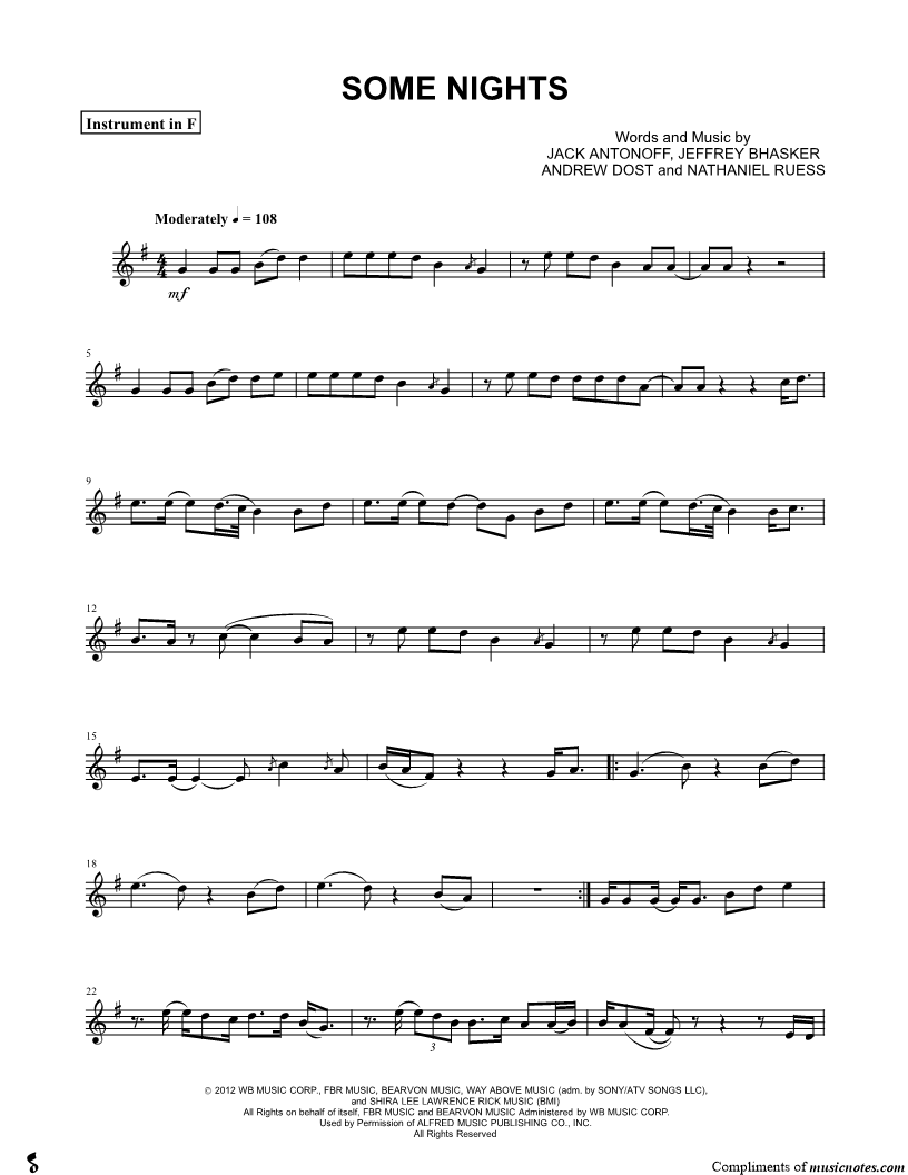 1. Some Nights - F Instrument (click here to preview and play this piece) Performer: Composers: Lyricists: Scored For:Instrumental Solo and Instrumental Part Instrument:F Instrument, range: G3-G5 Number of pages:4 Click here to purchase this piece separately for $4.99 |