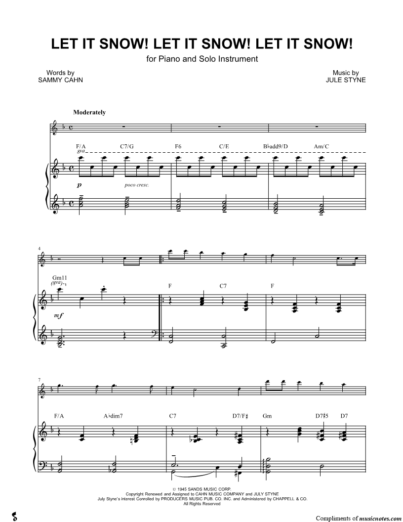 1. Let It Snow! Let It Snow! Let It Snow! - Piano Accompaniment (click here to preview and play this piece) Composer: Lyricist: Scored For:Solo & Accompaniment and Instrumental Part Instruments:Piano Accompaniment, C Instrument, range: C5-E6, Violin, Oboe, Flute and Recorder Number of pages:3 Click here to purchase this piece separately for $5.99 |