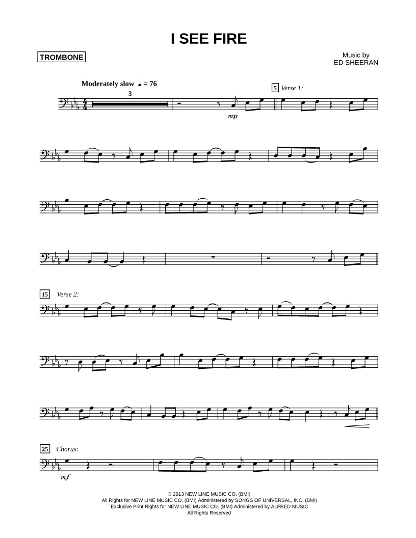 1. I See Fire - Trombone (click here to preview and play this piece) Performer: Composer: Lyricist: Scored For:Instrumental Part and Instrumental Solo Instrument:Trombone, range: Bb2-Bb3 Number of pages:2 Click here to purchase this piece separately for $4.99 |