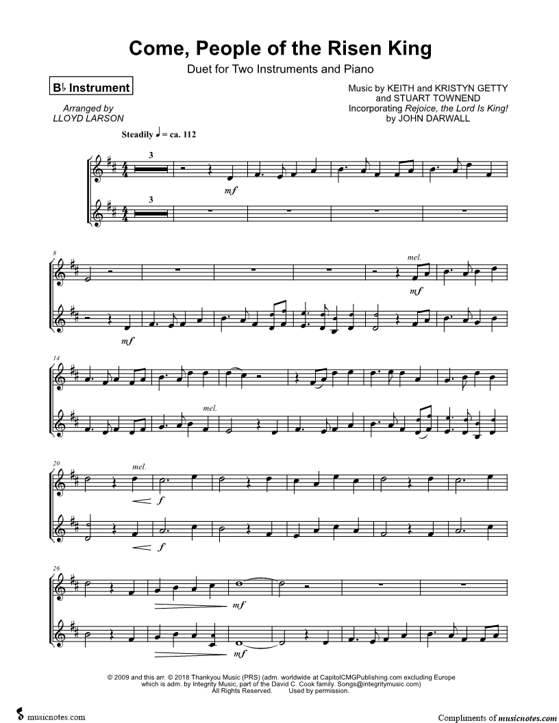1. Come, People of the Risen King - Bb Instrument Duet (click here to preview and play this piece) Performer: Composers: Lyricists: Scored For:Instrumental Duet and Instrumental Parts Instruments:Bb Instrument 1, range: D4-G#5, Bb Instrument 2, range: B3-E5, Trumpet, Soprano Saxophone, Tenor Saxophone and Clarinet Number of pages:3 Click here to purchase this piece separately for $4.99 |