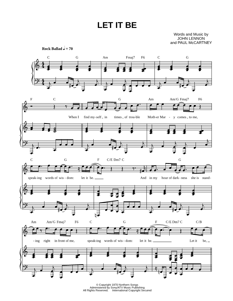 1. Let It Be (click here to preview and play this piece) Performer: Composers: Lyricists: Scored For:Piano/Vocal/Chords and Singer Pro Instruments:Voice, range: E4-C6 and Piano Number of pages:6 Click here to purchase this piece separately for $5.99 |