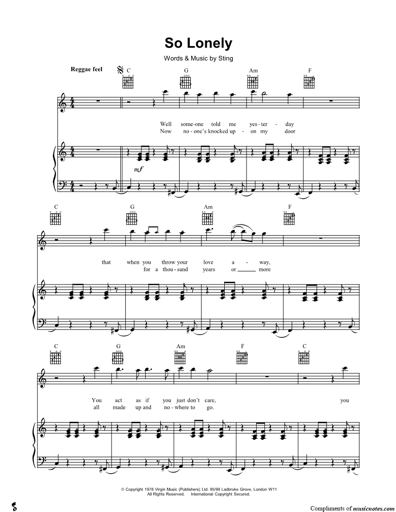 1. So Lonely (click here to preview and play this piece) Performer: Composer: Lyricist: Scored For:Piano/Vocal/Guitar and Singer Pro Instruments:Voice, range: C5-D6, Piano, Guitar and Backup Vocals Number of pages:4 Click here to purchase this piece separately for $5.99 |