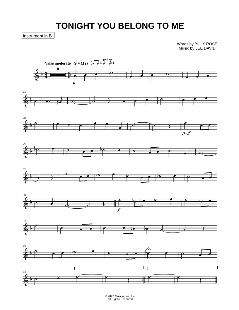 1. Tonight You Belong to Me - Bb Instrument (click here to preview and play this piece) Performer: Composers: Billy Rose and David Lee Lyricists: Billy Rose and David Lee Scored For:Instrumental Solo and Instrumental Part Instruments:Bb Instrument, range: F4-G5, Trumpet, Soprano Saxophone, Tenor Saxophone and Clarinet Number of pages:1 Click here to purchase this piece separately for $4.99 |