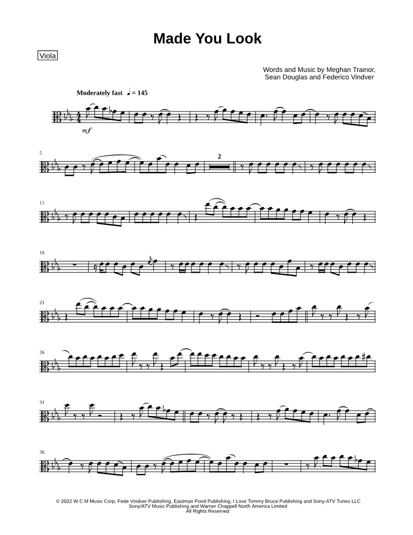 1. Made You Look - Viola (click here to preview and play this piece) Performer: Composers: Lyricists: Scored For:Instrumental Solo and Instrumental Part Instrument:Viola, range: Bb3-F5 Number of pages:2 Click here to purchase this piece separately for $4.99 |
