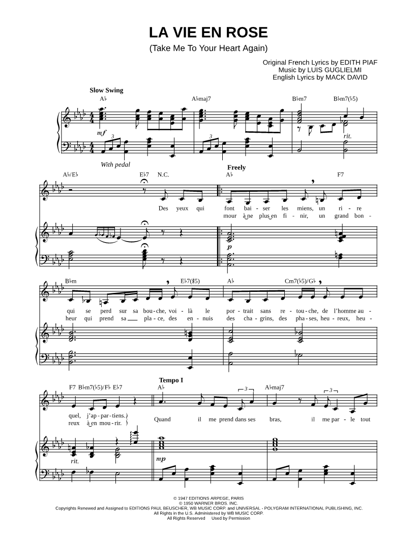 1. La Vie en rose (click here to preview and play this piece) Performer: Composer: Lyricist: Scored For:Piano/Vocal/Chords and Singer Pro Instruments:Voice, range: G3-C5 and Piano Number of pages:3 Click here to purchase this piece separately for $5.99 |