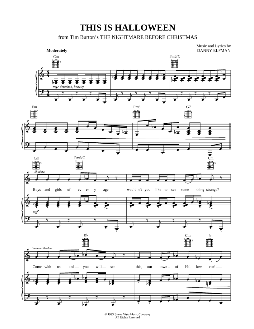 1. This Is Halloween (click here to preview and play this piece) Composer: Lyricist: Scored For:Piano/Vocal/Guitar Instruments:Voice, range: F#3-Eb5, Piano and Guitar Number of pages:8 Click here to purchase this piece separately for $5.99 |
