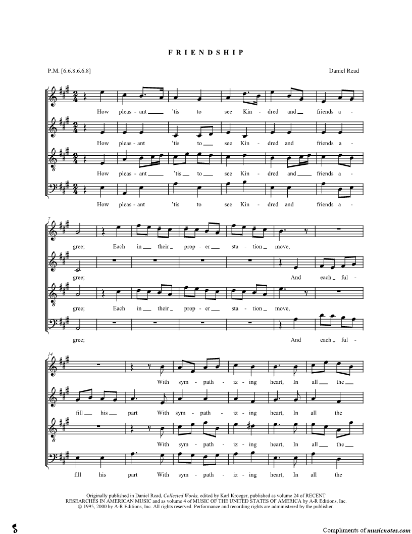 How pleasant 'tis to see Kindred and friends agree; Each in their proper station move, With sympathizing heart, In all the cares of life and love! |