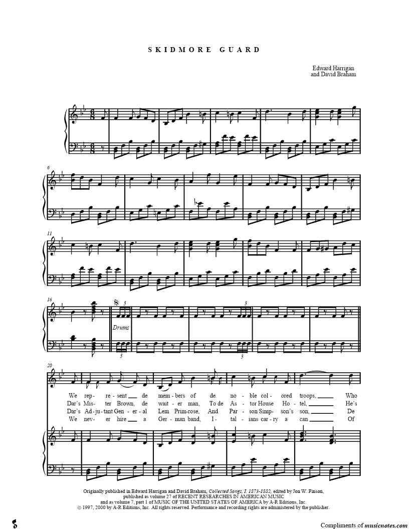 We represent de members of de noble colored troops, Who march about de streets of York, In French imperial suits, Black pantaloons and yaller stripes, And helmets trimmed with blue. |