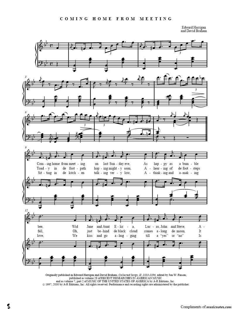 Coming home from meeting on last Sunday eve, As happy as a bumble bee, Wid Jane and Aunt Eliza, Lucas, John and Steve, Asinging in de key of C; Down by de crossroads, close to de mound, We had for to stand right still. |