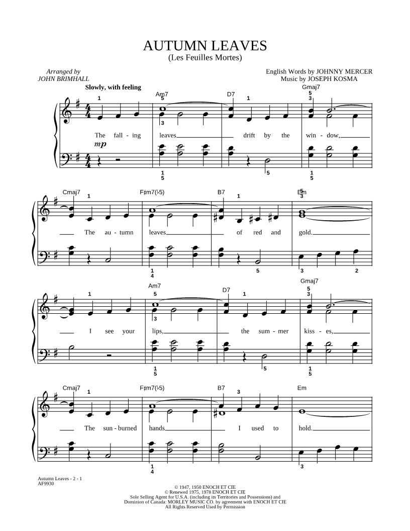 The falling leaves drift by the window, The autumn leaves of red and gold. |