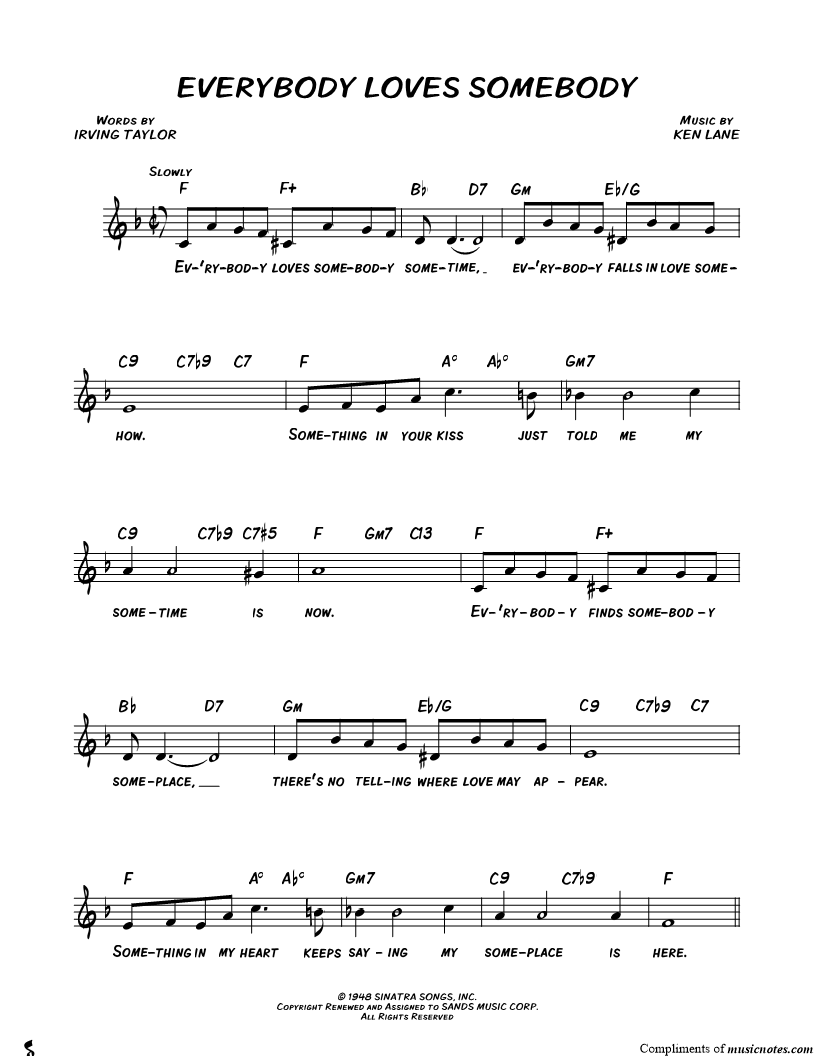 Ev'rybody loves somebody sometime, ev'rybody falls in love somehow. |
