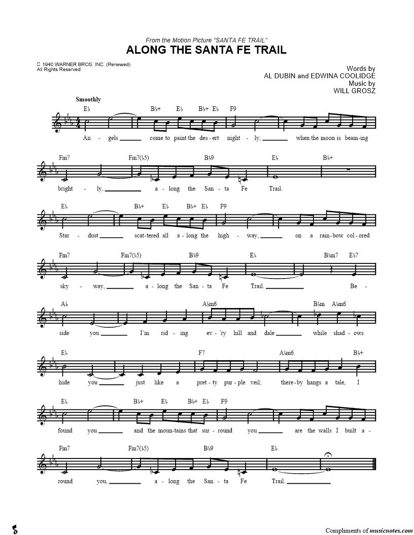 Angels come to paint the desert nightly, when the moon is beaming brightly, along the Santa Fe Trail. |