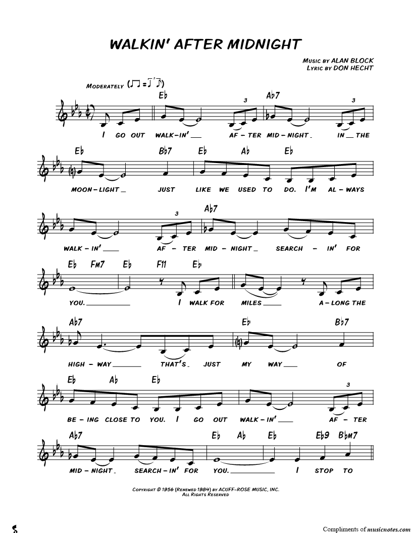 I go out walkin' after midnight in the moonlight just like we used to do. |