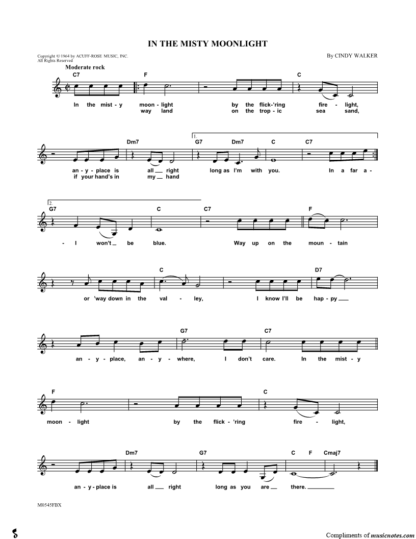 In the misty moonlight by the flick'ring firelight, anyplace is all right long as I'm with you. |
