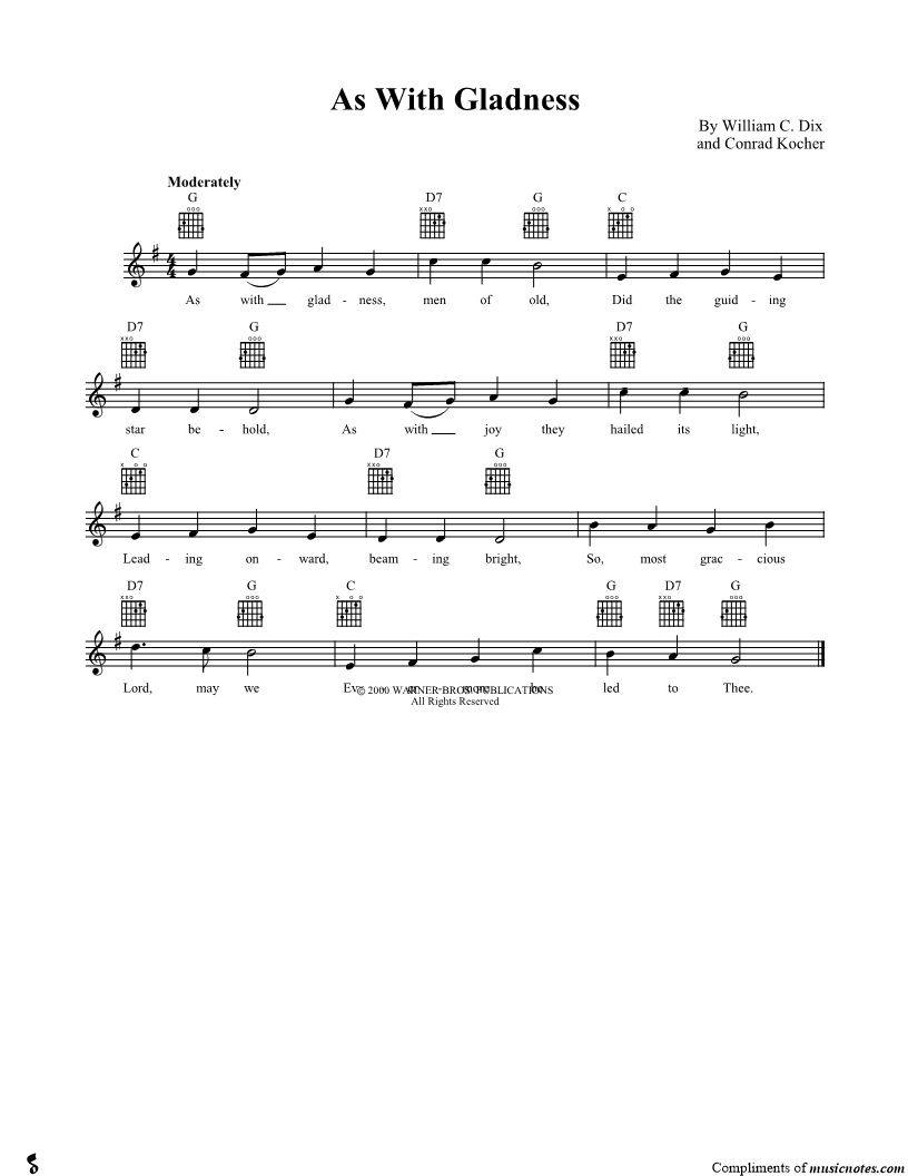 As with gladness, men of old, Did the guiding star behold, As with joy they hailed its light, Leading onward, beaming bright, So, most graccious Lord, may we Evermore be led to Thee. |