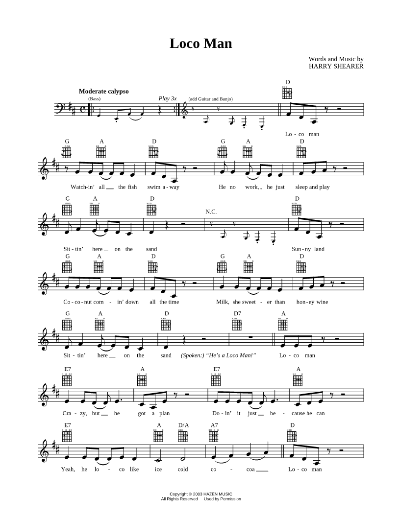 Loco man Watchin' all the fish swim away He no work, he just sleep and play Sittin' here on the sand Sunny land Coconut comin' down all the time Milk, she sweeter than honey wine Sittin' here on the sand (Spoken:) "He' |