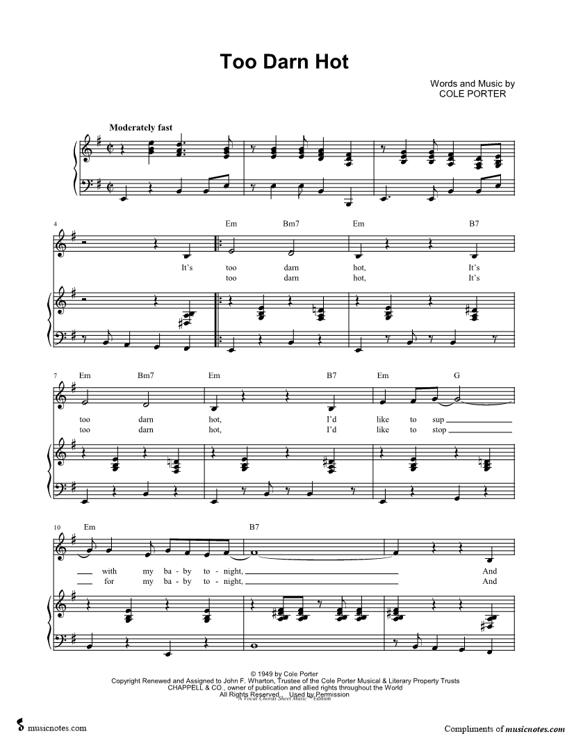It's too darn hot, it's too darn hot, I'd like to sup with my baby tonight, and play the pup with my baby tonight. |
