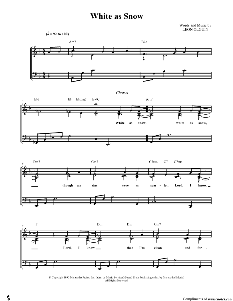White as snow, white as snow, though my sins were as scarlet, Lord, I know, Lord, I know that I'm clean and forgiven. |