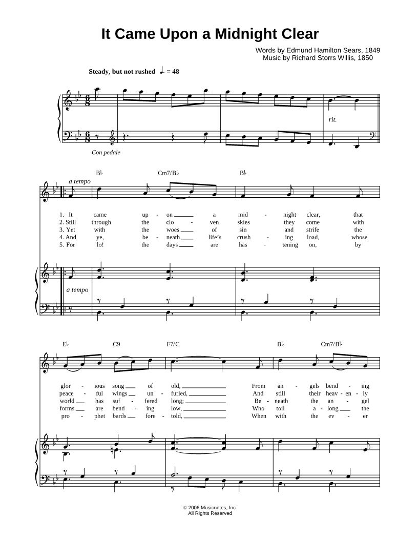 It came upon the midnight clear, that glorious song of old, From angels bending near the earth, to touch their harps of gold; |