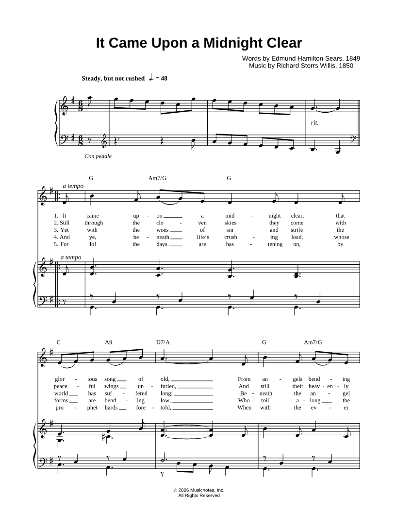 It came upon the midnight clear, that glorious song of old, From angels bending near the earth, to touch their harps of gold; |