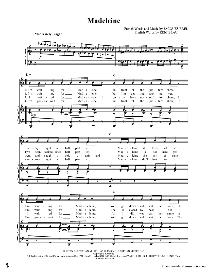 I'm waiting for Madeleine in front of the picture show, ev'ry night at half past ten, Madeleine she loves that so. |