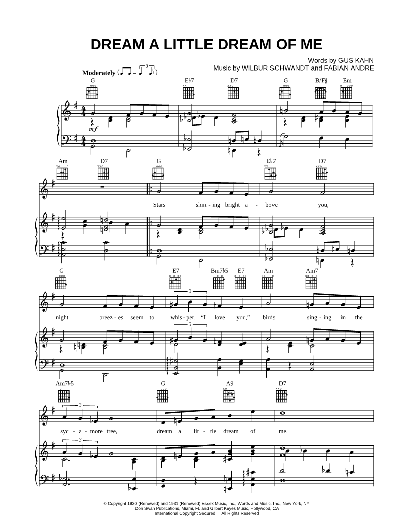 Stars shining bright above you, night breezes seem to whisper, ``I love you,'' birds singing in the sycamore tree, dream a little dream of me. |