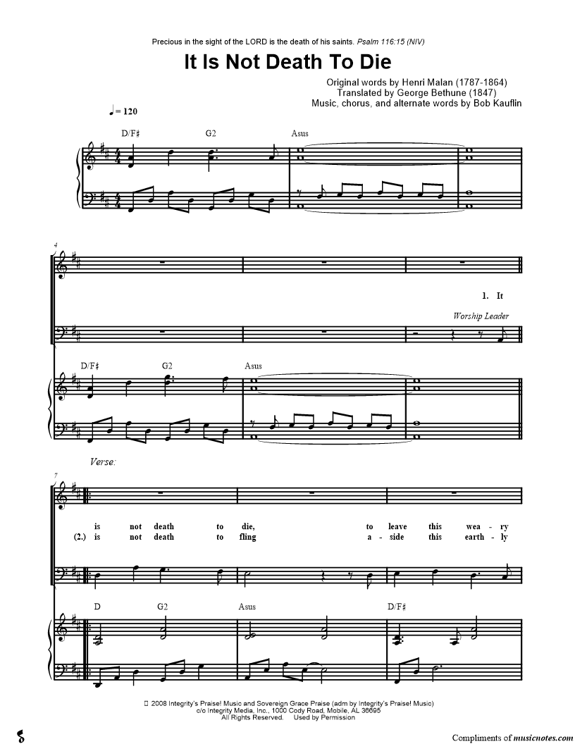 It is not death to die, to leave this weary road, and join the saints who dwell on high, who've found their home with God; |