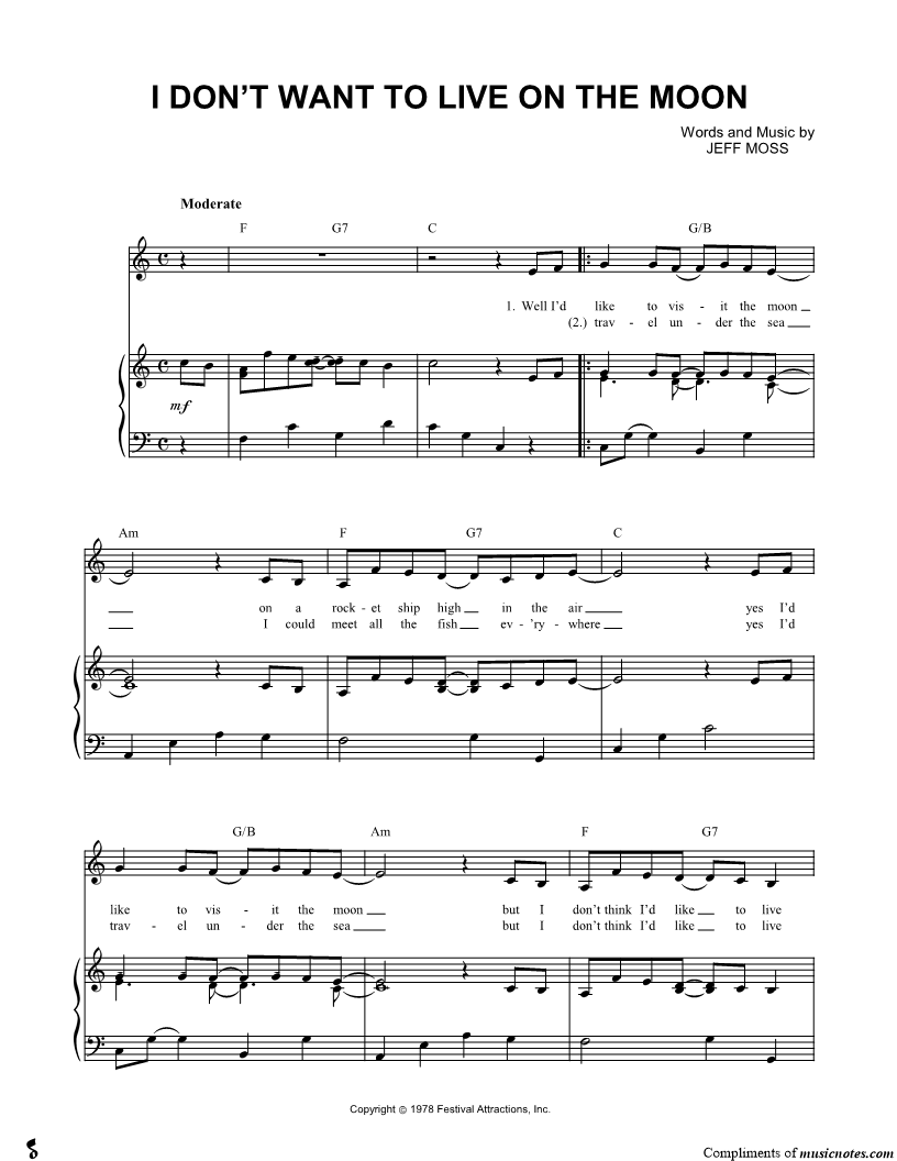 Well I'd like to visit the moon on a rocket ship high in the air yes I'd like to visit the moon but I don't think I'd like to live there Though I'd like to look down at the earth from above I'd miss all the places and |