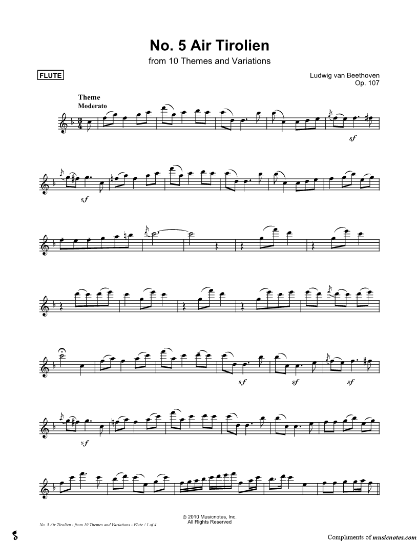 Op. 107, No. 5. Air Tirolien - Flute (C Instrument) & Piano from 10 Themes and Variations