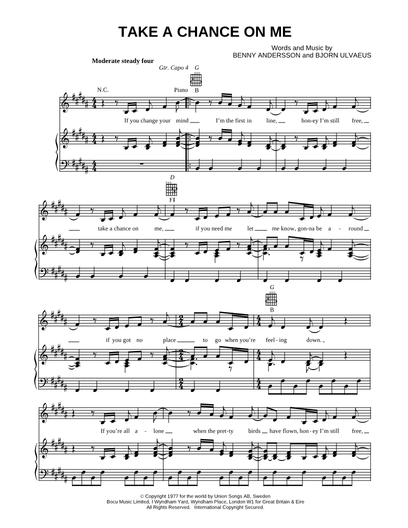 If you change your mind I'm the first in line, honey I'm still free, take a chance on me, if you need me let me know, gonbe around if you got no place to go when you're feeling down. |