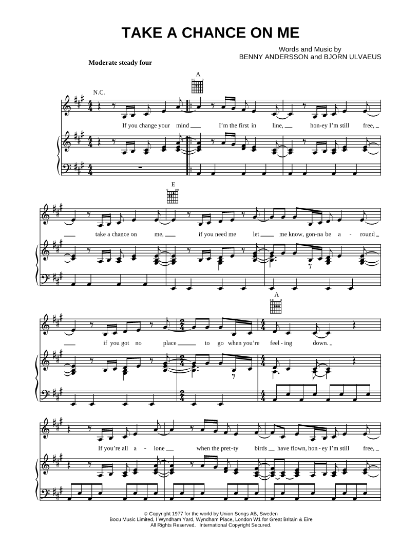 If you change your mind I'm the first in line, honey I'm still free, take a chance on me, if you need me let me know, gonbe around if you got no place to go when you're feeling down. |