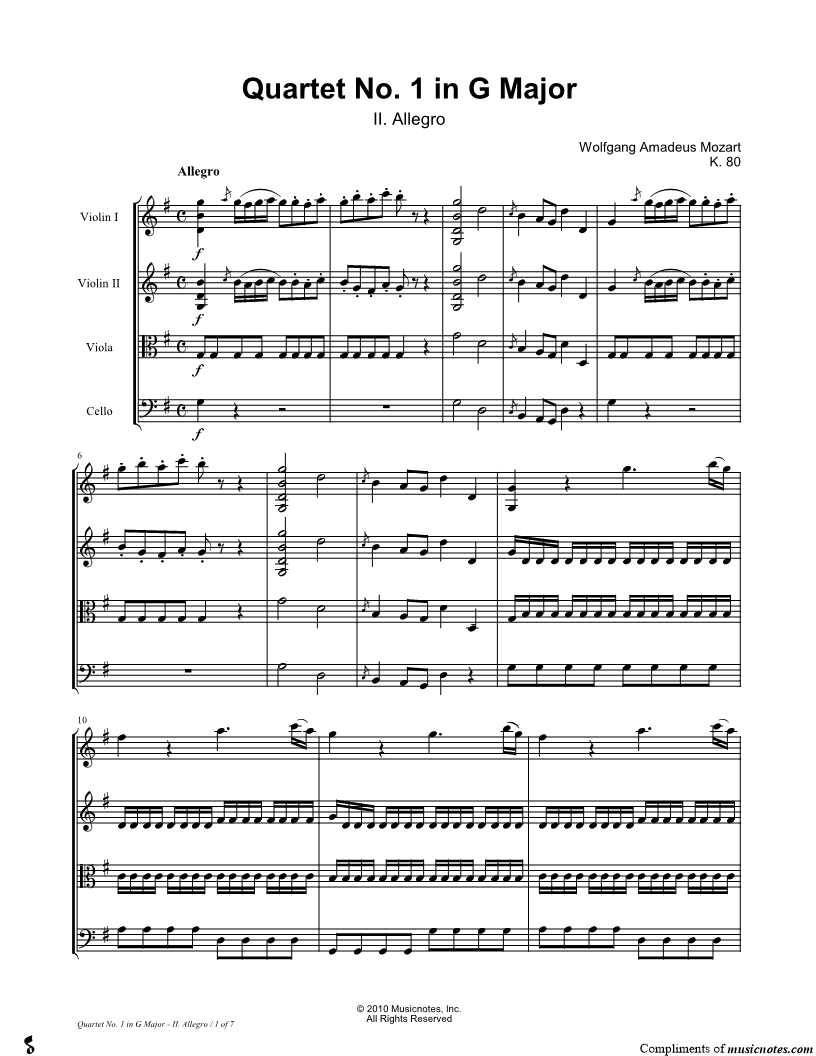 Quartet No. 1 In G Major, K. 80: II. Allegro - String Quartet Score |