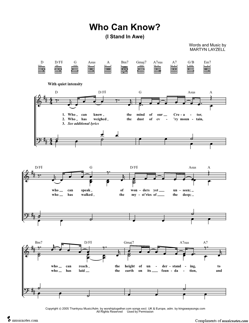 Who can know the mind of our Creator, who can speak of wonders yet unseen; who can reach the height of understanding, to play the notes of wisdom's melody? |