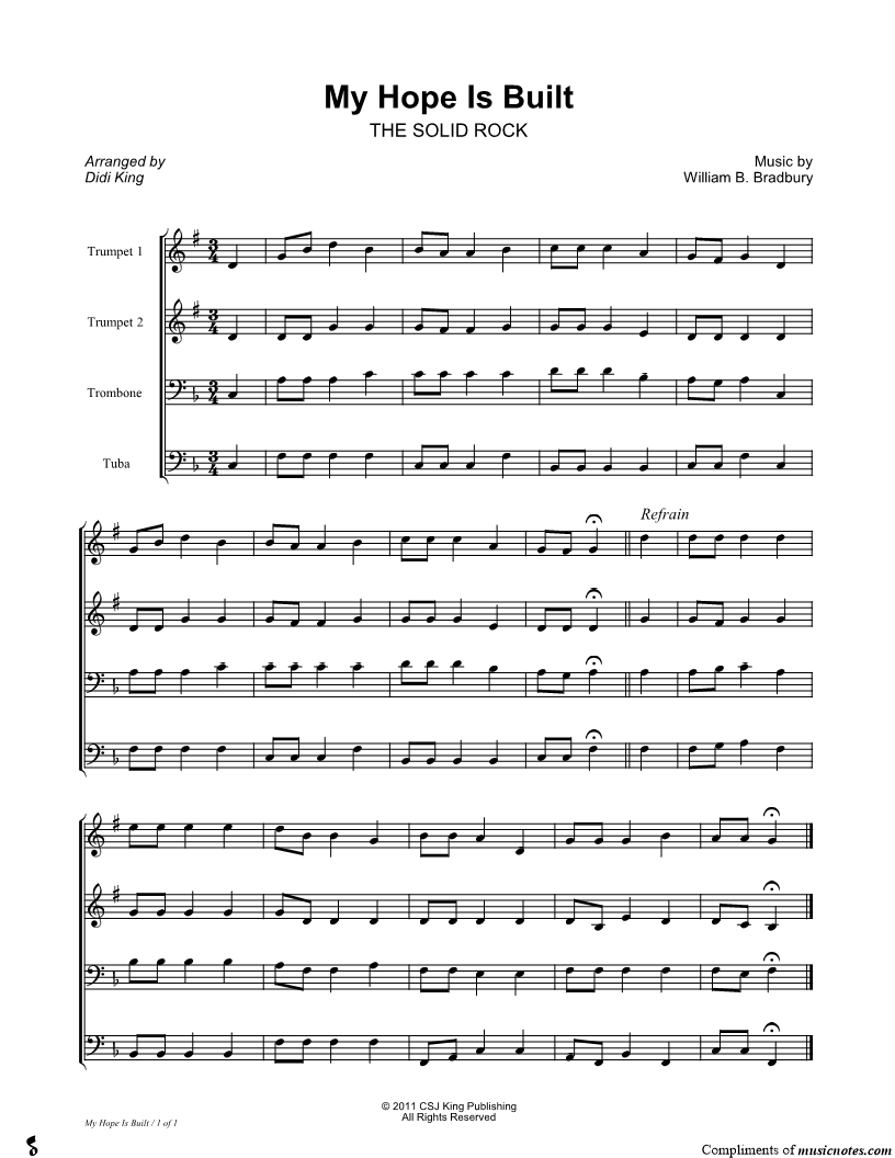 Trumpet 1, range: D4-E5 Trumpet 2, range: B3-G4 Trombone, range: C3-D4 Tuba, range: F2-A3 | |