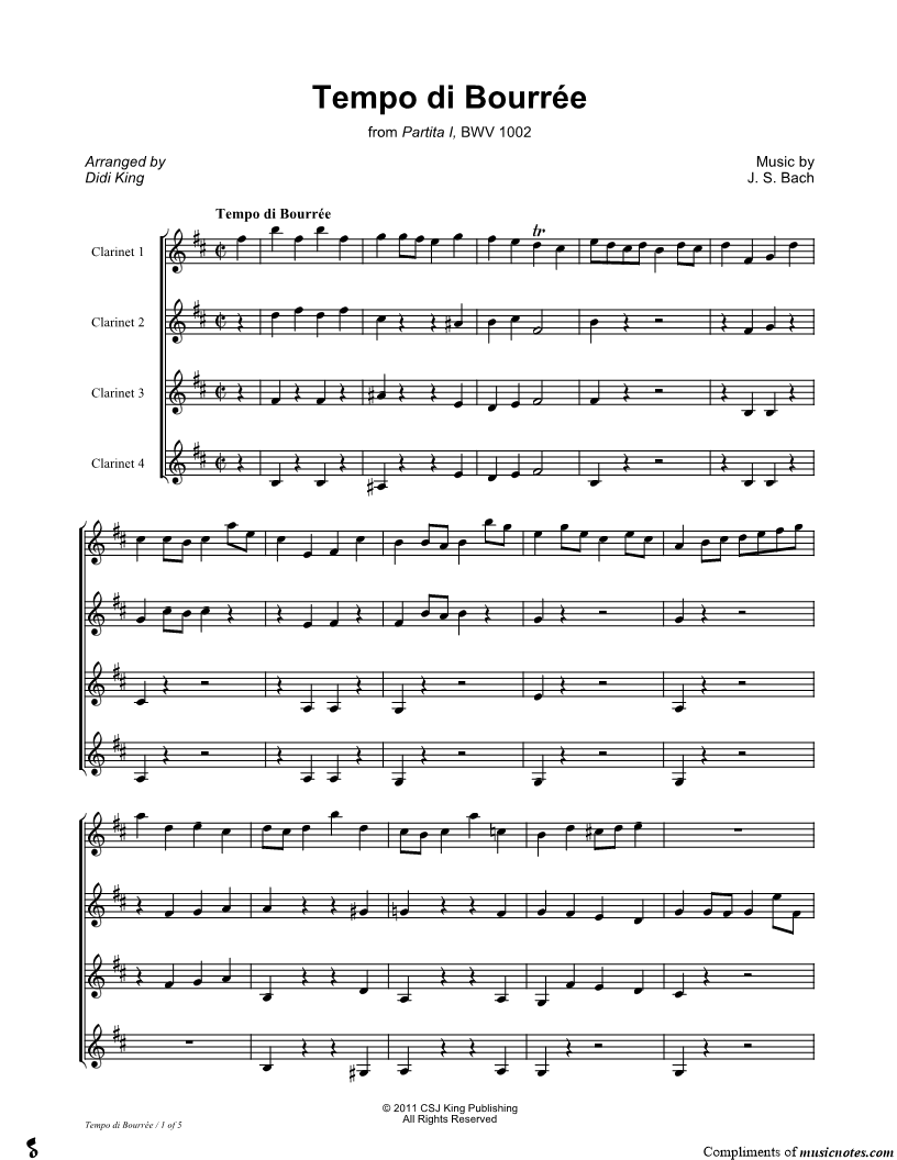 Bourrée, from Sonata II, BWV 1003 - Clarinet Quartet Score |