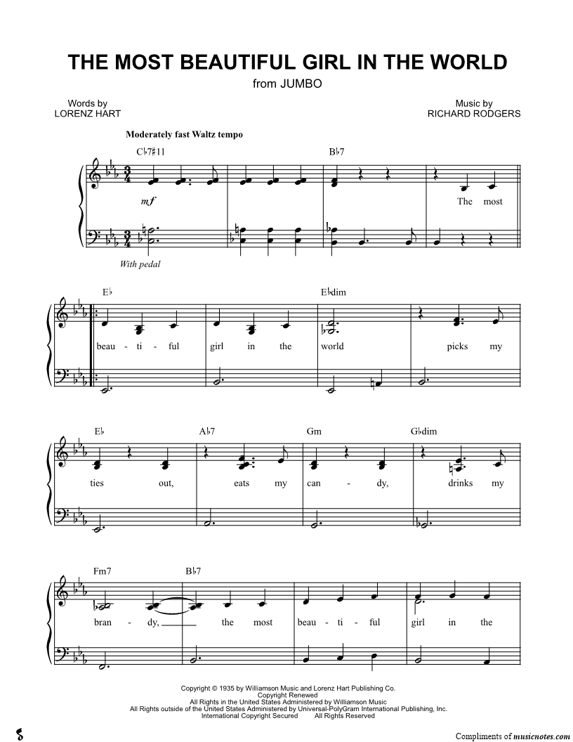The most beautiful girl in the world picks my ties out, eats my candy, drinks my brandy, the most beautiful girl in the world. |