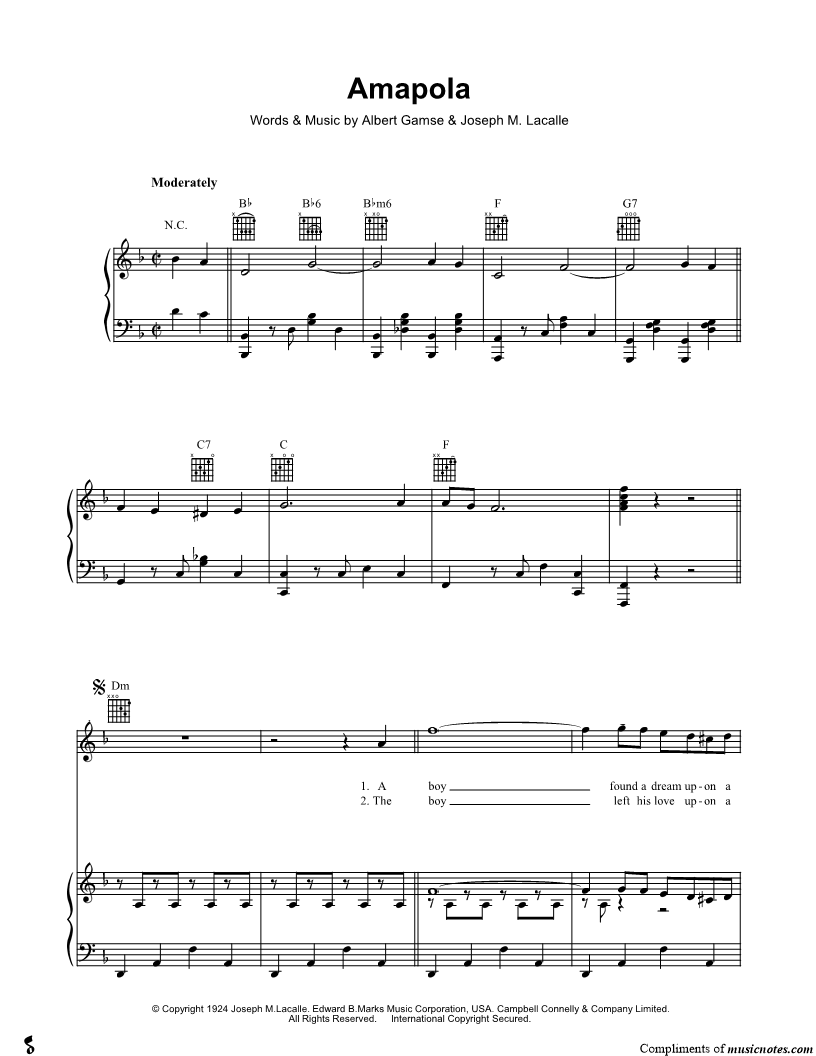 A boy found a dream upon a distant shore, a maid with a way of whisp'ring “si Senor.” Each night while guitars would softly play, the tune seem'd to dance 'round the words that he'd say Amapola, my pretty little poppy, you're like that lovely flow'r so sweet and heavenly. |
