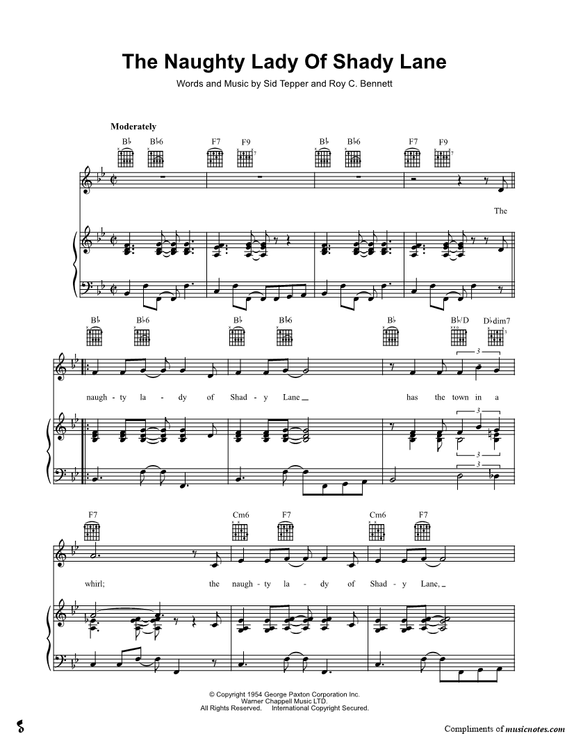 The naughty lady of Shady Lane has the town in a whirl; the naughty lady of Shady Lane, me oh my, oh what a girl. |