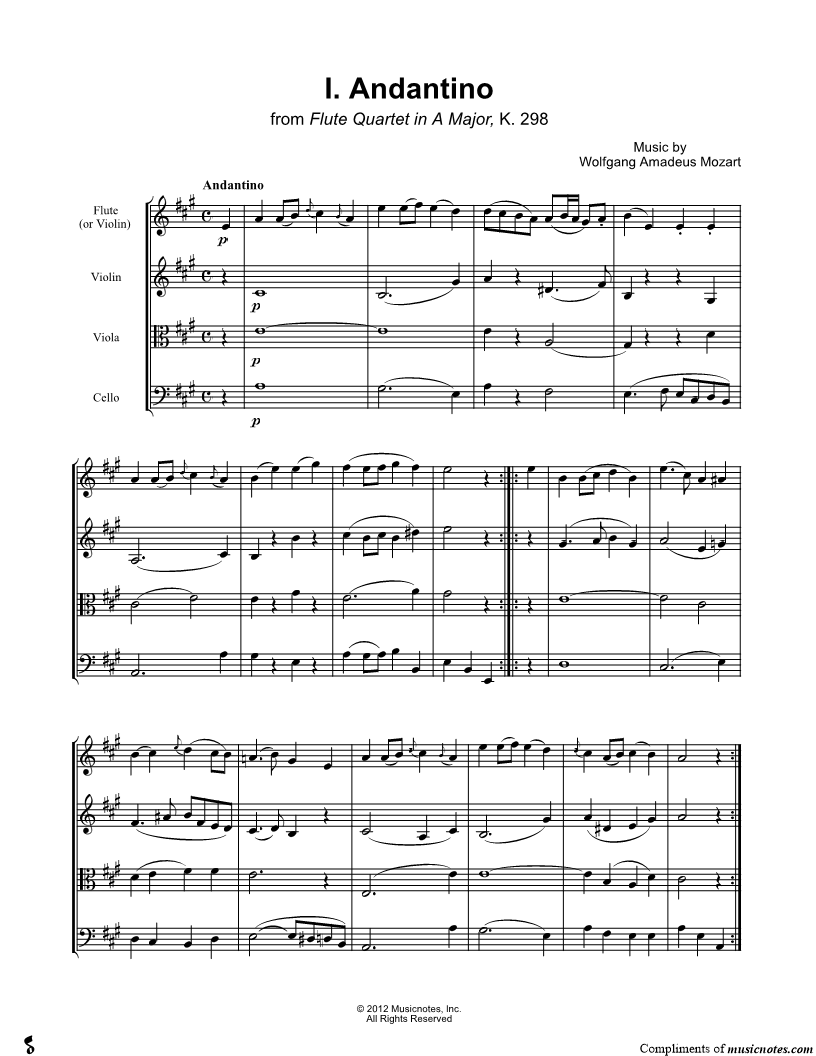 Flute Quartet in A Major, K. 298: I. Andantino for Flute and String Trio