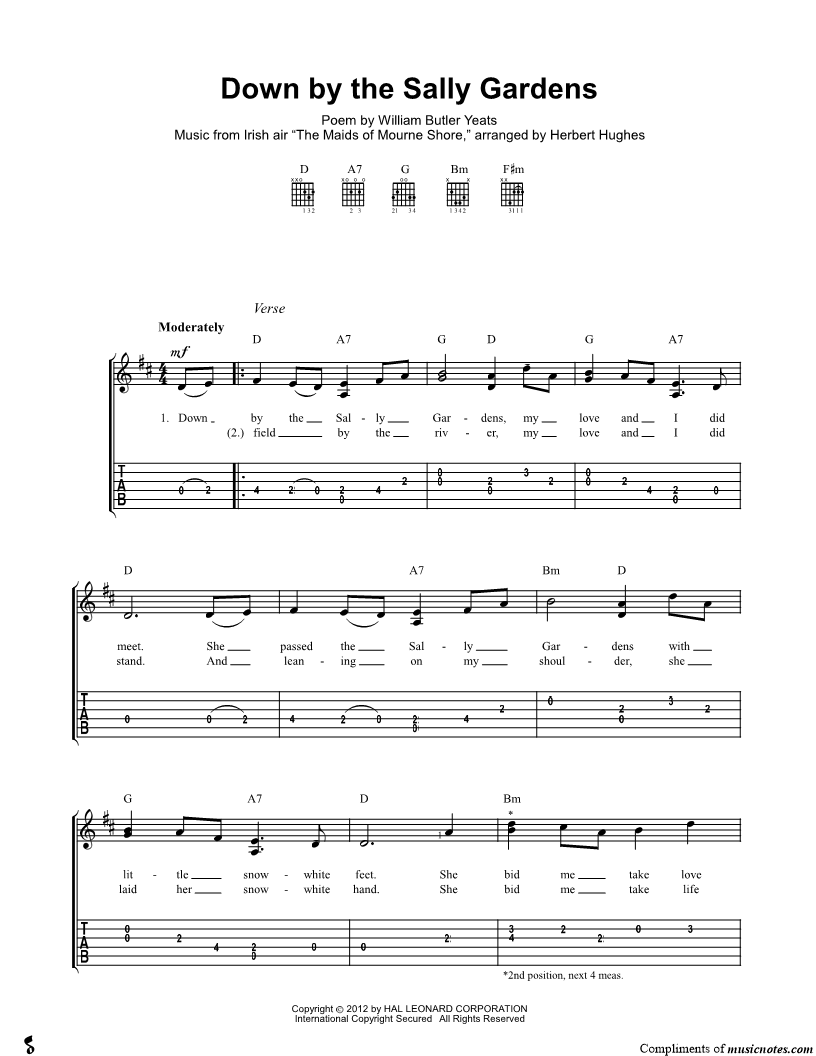 Down by the Sally Gardens, my love and I did meet. |