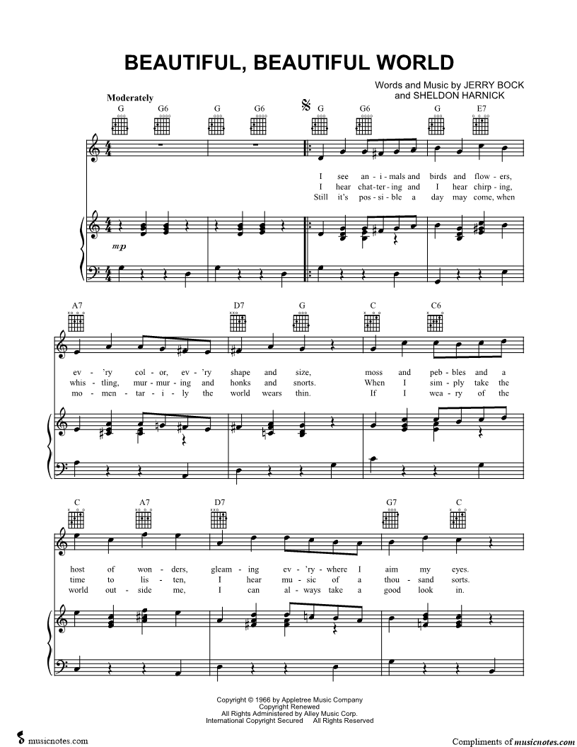 I see animals and birds and flowers, ev'ry color, ev'ry shape and size, moss and pebbles and a host of wonders, gleaming ev'rywhere I aim my eyes. |