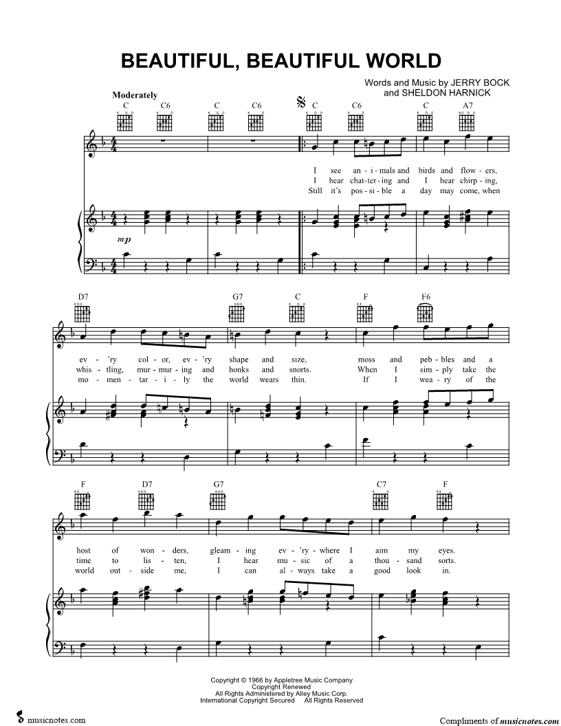 I see animals and birds and flowers, ev'ry color, ev'ry shape and size, moss and pebbles and a host of wonders, gleaming ev'rywhere I aim my eyes. |