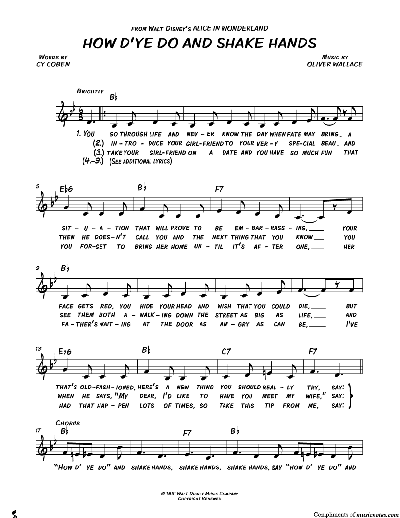 You go through life and never know the day when fate may bring a situation that will prove to be embarrassing, your face gets red, you hide your head and wish that you could die, but that's oldfashioned, here's a new thing you should really try, say How d' ye do" and shake hands, shake hands, shake hands, say "how d' ye do" and shake hands, state your name and bus'ness. |