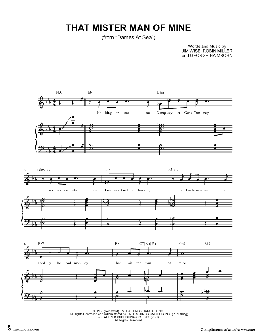 No king or tsar no Dempsey or Gene Tunney no movie star his face was kind of funny no Lochinvar but Lordy he had money That mister man of mine. |