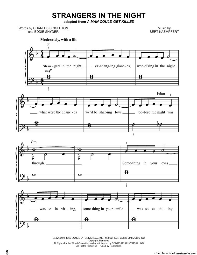 Strangers in the night, exchanging glances, wond'ring in the night what were the chances we'd be sharing love before the night was through. |