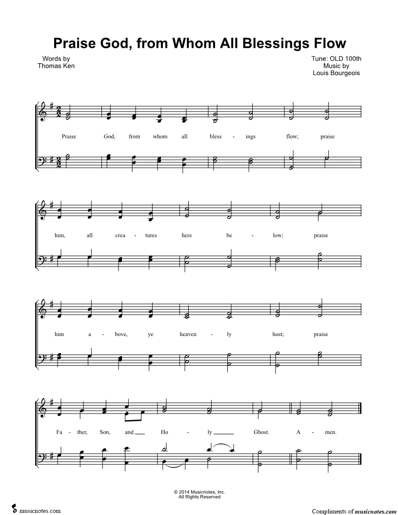 Praise God, from whom all blessings flow; praise him, all creatures here below; praise him above, ye heavenly host; praise Father, |